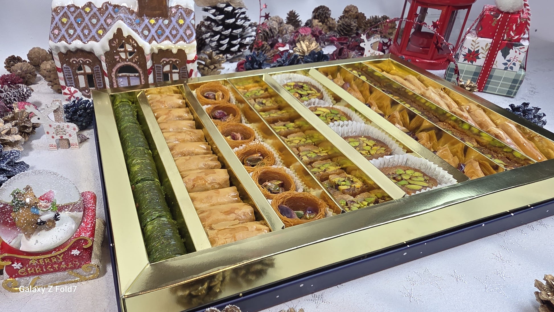 Ulepsz swoje świąteczne uroczystości dzięki arabskiemu pudełku na słodycze „Wesołych Świąt” Afamia Bakery. To wyjątkowe pudełko, zaprojektowane tak, aby ucieleśniać radość sezonu, zabierze Cię w magiczną podróż przez święta. Dzięki mieszance elementów arabskich i napisowi „Wesołych Świąt” pudełko oferuje nowoczesny i innowacyjny akcent obchodom Bożego Narodzenia. W środku znajdziesz wyśmienity asortyment arabskich słodyczy, pieczołowicie przygotowanych z najlepszych składników. Niezależnie od tego, czy będzie to przemyślany prezent dla bliskich, czy też udoskonalenie własnych uroczystości, pudełko „Mery Crecmes” zapewnia magiczne wakacje wypełnione pysznymi smakami i urzekającym designem. Świętuj Boże Narodzenie wyjątkowo z Afamia Bakery.